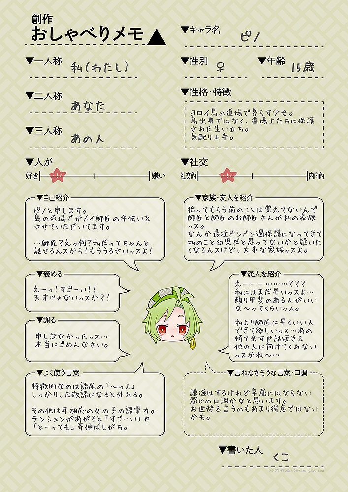 おおらかで大雑把な師匠と対照的な気配り上手だが、 人付き合いはあまり得意でないためあまり知らない人を見るとよく師匠の後ろに隠れている。