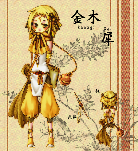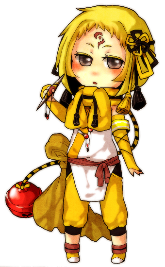 武器は両刃の変形小刀が二本。 普段は刃の間の輪を持ちクナイの様に使用したり投げたりしており、投げるときは小刀に付いた火打ち石と刃が打ち合い自然と高温の刃となる。