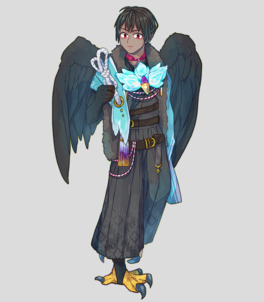 元々は狭間の神々に仕えていた神使だったが、妖精の森ができる直前頃、理不尽に放り出され堕天し髪も翼も真っ黒になってしまった。