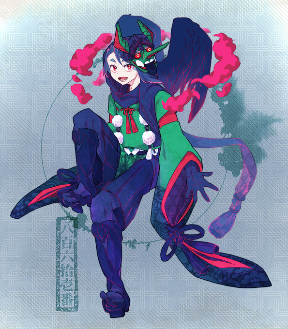 悪戯好きな性格で、怖い鬼の面を着けて自らの髪で作った翼を大きく広げ、社に来た人を驚かせては笑っている。
