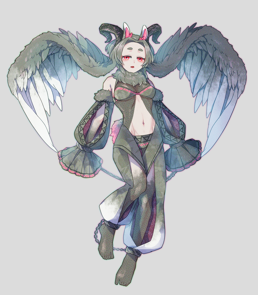 巨大な鳥のような翼をもつが飛ぶことはできず、両手足には枷と鎖、 封印のため常に半分眠っている状態の女性。