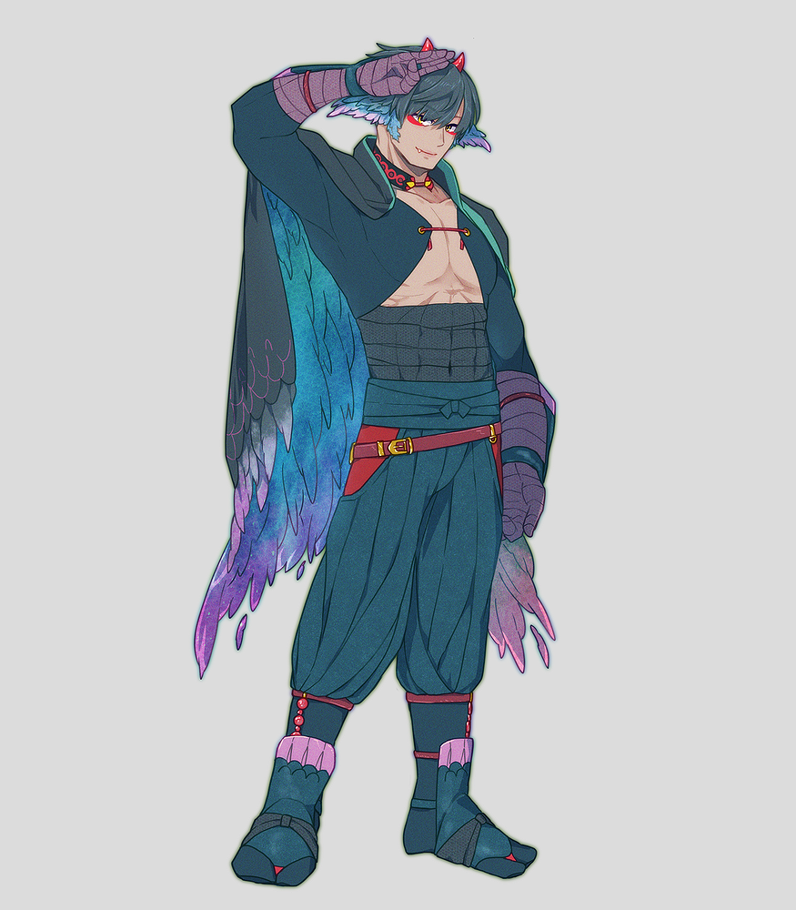 羽織っている上着は自身の髪羽毛が素材になっていて、よく翼や首巻きに変形させて使っている。