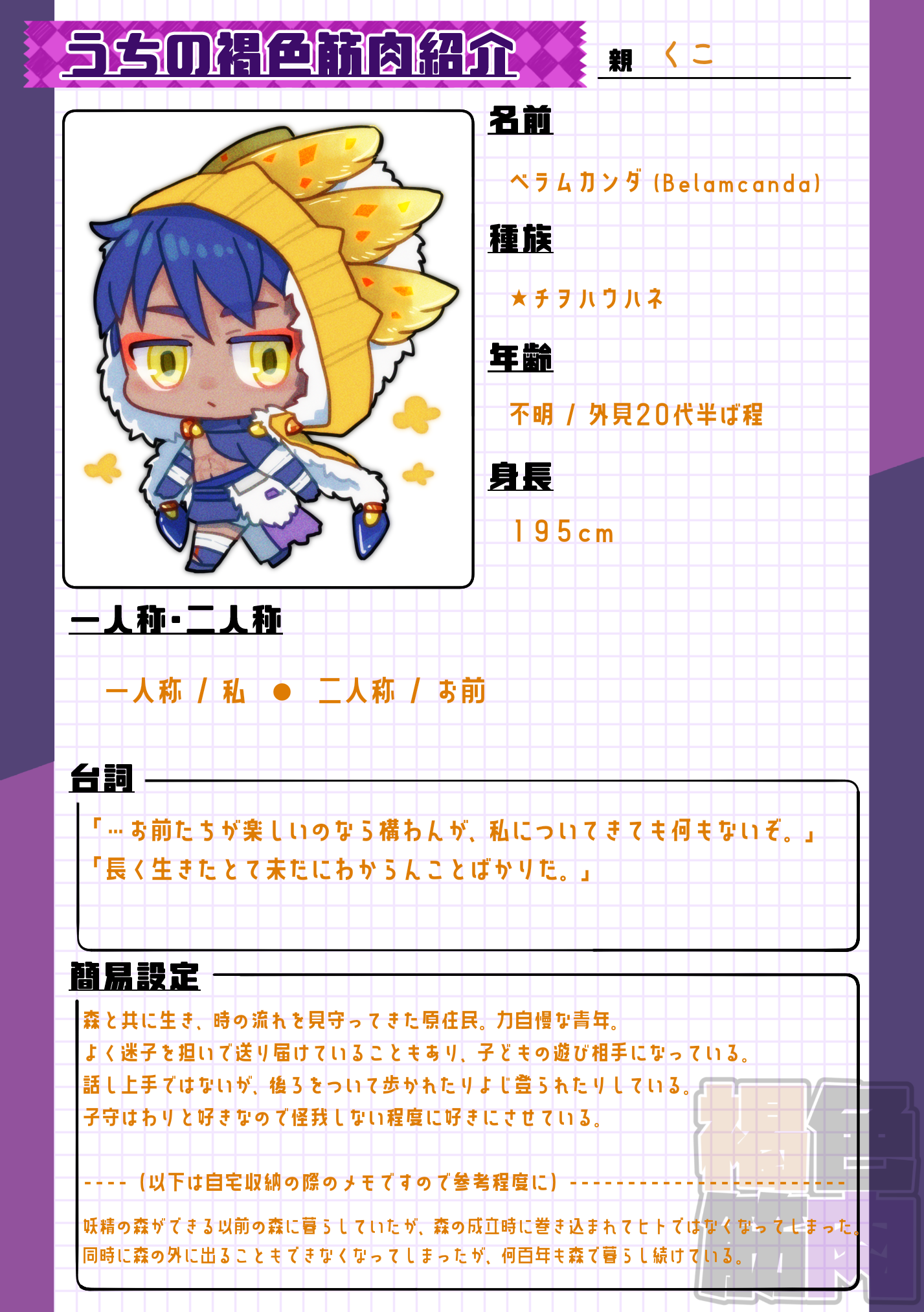 妖精の森ができる以前の森に暮らしていたのだが、 妖精の森となった際の変動に巻き込まれてヒトではなくなってしまった。